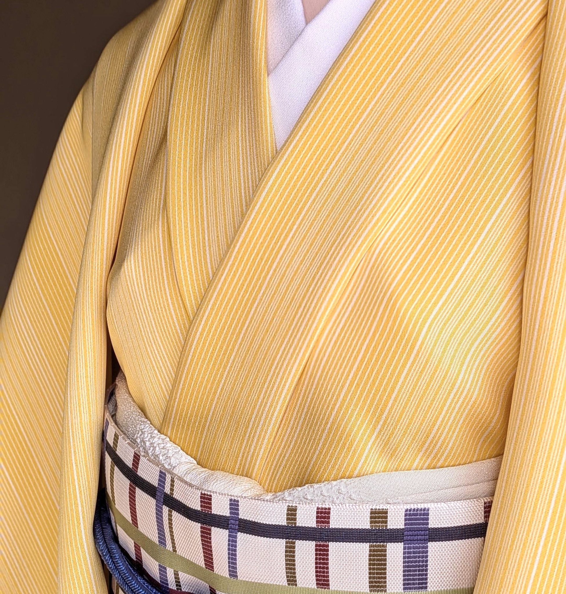 粋に見える縞小紋も菜の花畑のような地色が柔らかで、うららかな春のようです。