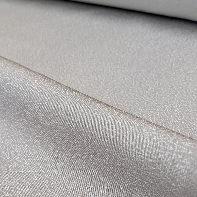 冬の庭の情景を描いた敷松葉の柄の江戸小雪を思わせる銀鼠色に染め上がりました。