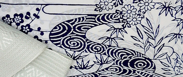茶屋辻文様の柄を綿の白地の生地で紺一色できっぱり染め上げました。
